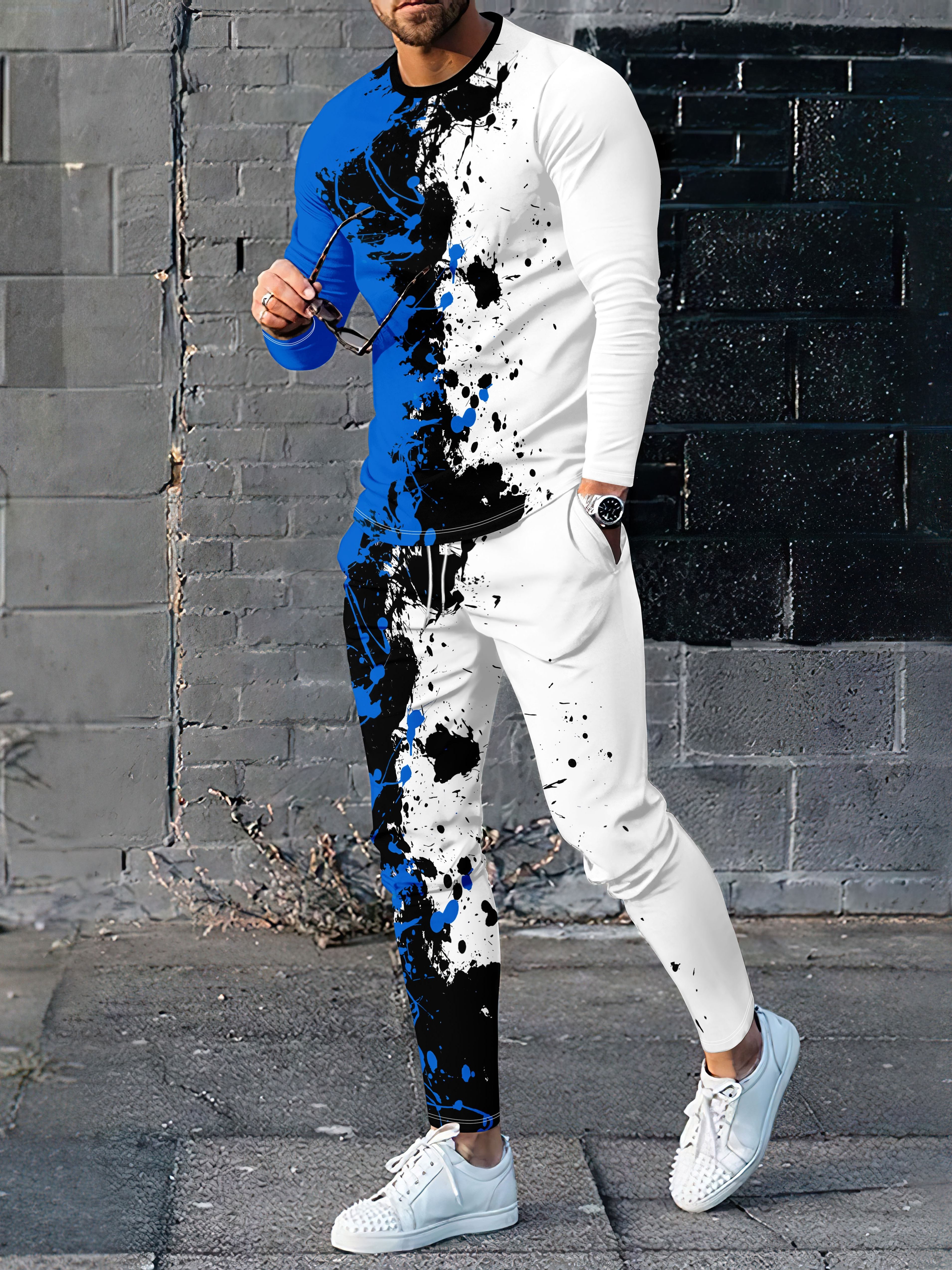 Blue Fire & Leaf Pattern Print, 2Pcs Outfits For Men